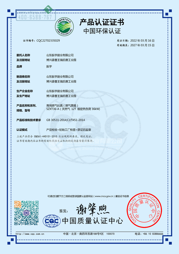 燃氣蒸箱CQC環(huán)保產(chǎn)品認證證書