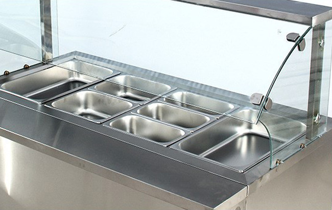 豪華保溫售飯臺整體采用不銹鋼板材+優(yōu)質(zhì)鋼化玻璃,規(guī)格有大三格、四格、五格、六格(其他規(guī)格可定制),并配有不銹鋼可調(diào)節(jié)腿(或根據(jù)需要更換為可移動耐磨靜音腳輪),保溫售飯臺不銹鋼食物盆需根據(jù)需求另配。